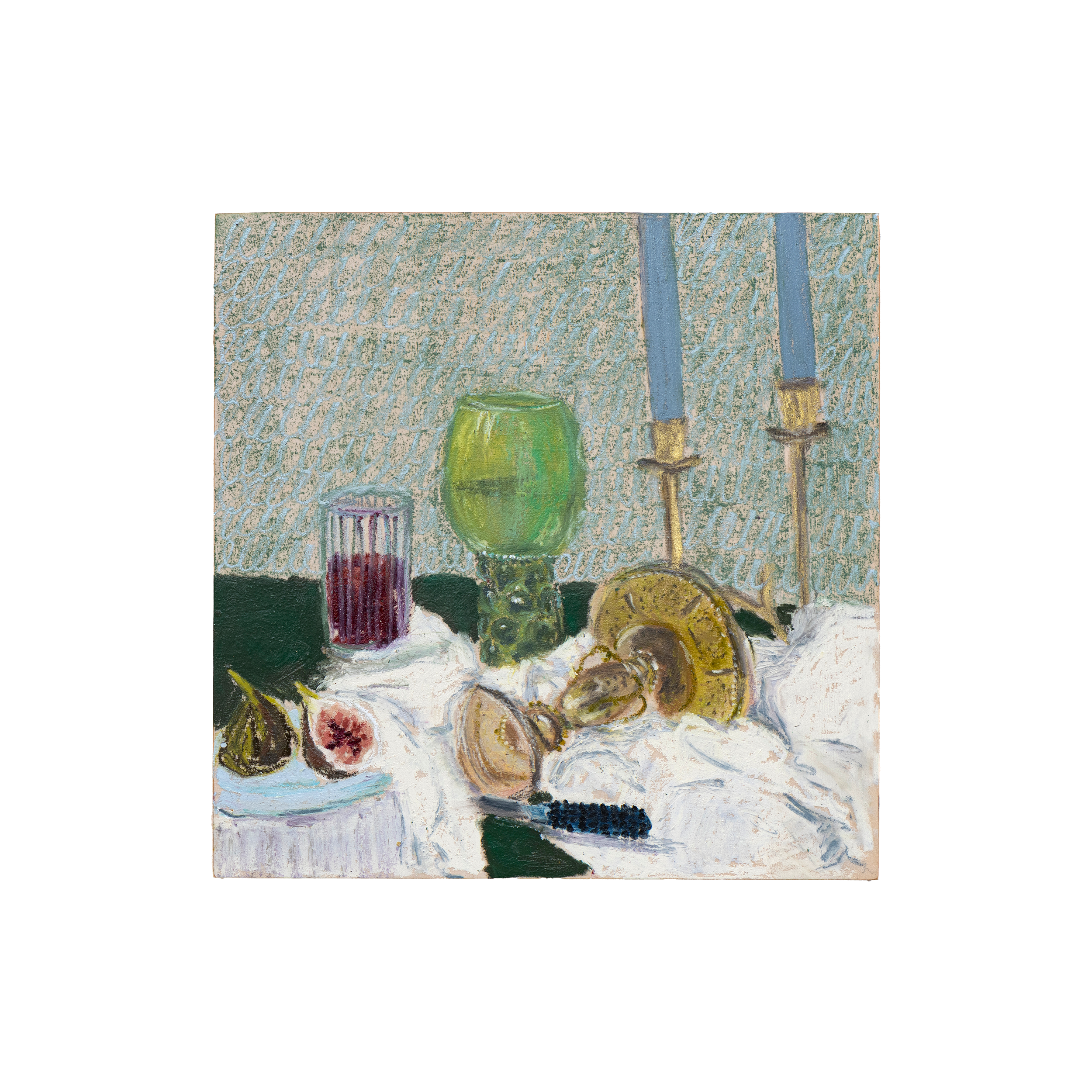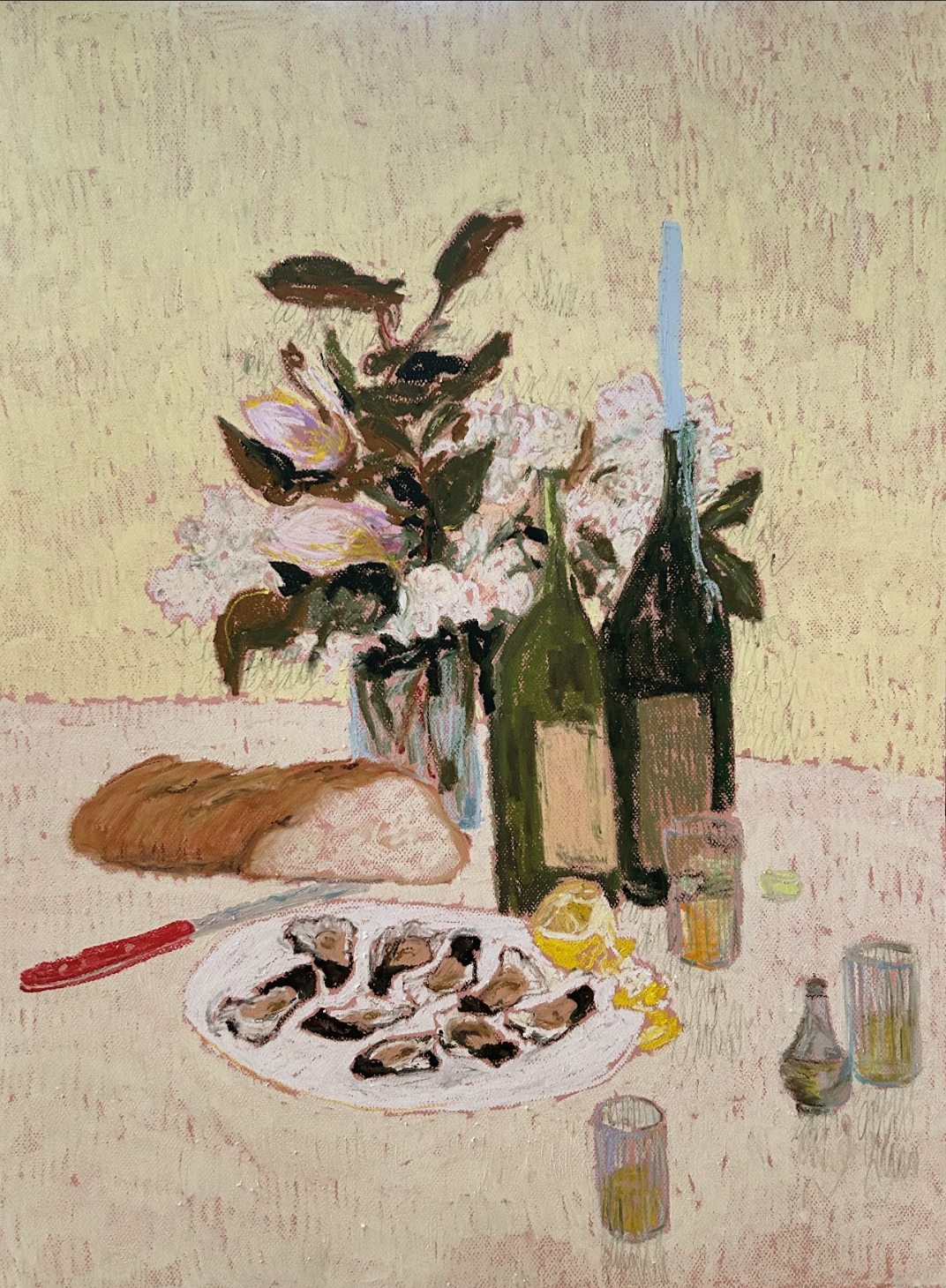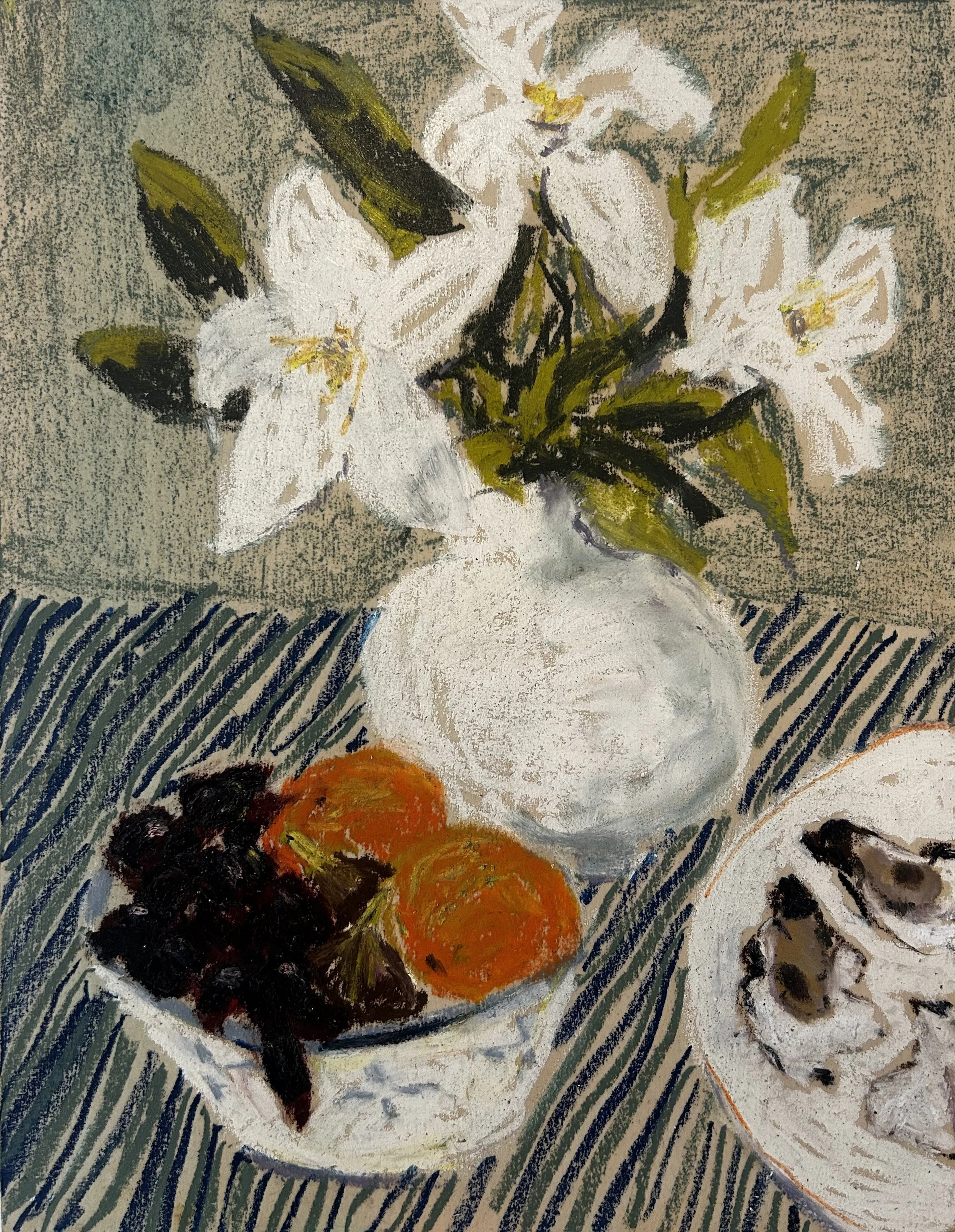 Phoebe Stone, based in Sydney, Australia, is an artist whose practice centers on the expressive potential of oil pastels. Stone’s work explores the beauty and balance found in the interplay of composition, color, pattern, and texture, often drawing inspiration from the quiet poetry of domestic life. Scenes of everyday objects—food, flowers, and household forms—are rendered with a sense of immediacy and vitality, reflecting Stone’s intuitive approach and her deep engagement with process.
